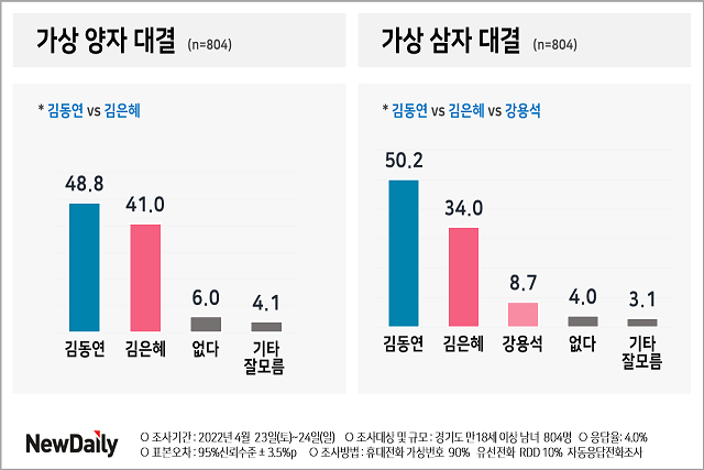 양자대결에서는 더불어민주당 김동연 후보가 48.8%, 국민의힘 김은혜 후보 41.%로 오차범위 밖인 7.8%로 나타났으며 다자대결의 경우 김동연 50.2%, 김은혜 34%, 강용석 8.7%로 나타나 양자 대결과 다자 대결 모두에서 앞서는 것으로 나타났습니다.