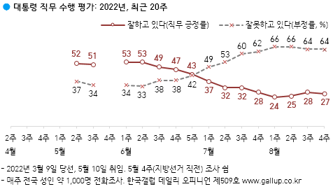 윤석열 대통령 여론조사 지지율 정리(갤럽 여론조사, 8월 12일 발표) 지난 8일 만 5세 취학 연령 하향에 따란 국민적 반발로 박순애 교육부 장관 자진 사퇴와 국민의힘 주호영 비대위가 출범하며