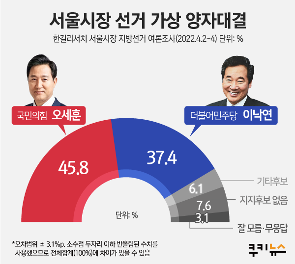 비록 이번 서울시장 선거에 출마를 하지 않은 이낙연 전 대표와의 지지율로 조사를 하였는데 가상 양자대결이었음에도 오세훈 현 시장이 45.8%, 이낙연 전 대표 37.4%로 역시 여유있는 리드를 보여주었습니다.