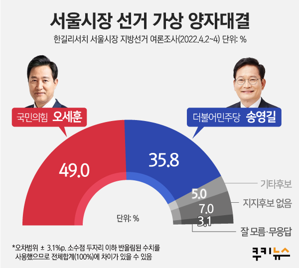 이번 여론조사에서는 국민의힘 오세훈 현 서울시장과 더불어민주당 전 대표인 송영길 전 대표에 대한 지지도를 물었는데 그 결과 49%가 국민의힘 오세훈 시장을 35.8%가 송영길 후보를 지지하는 것으로 나타나 대선에서 윤석열 당선인의 득표율을 거의 그대로 오세훈 현 시장이 흡수한 반면 이재명 후보의 득표율은 송영길 후보가 온전히 흡수하지 못하는 결과가 나타났습니다.