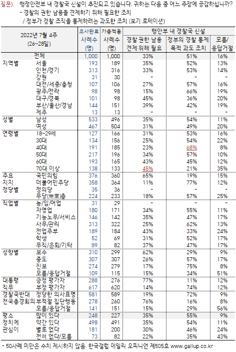이번 여론조사에서 행정안전부 내 경찰국 신설에 대한 의견을 물었는데 정부가 경찰조직을 통제하려는 과도한 조치라는 의견이 51%, 경찰의 권한 남용을 견제하기 위해 필요한 조치 33%로 과도한 조치라는 의견이 보다 높게 나타났으며 경찰국 반대 전국 총경회의에 대해서는 정당한 의사표명이 59%, 부적절한 집단행동이 26%로 나타나 많은 국민들이 지지의사를 보인점은 공무원에게 박한 평가를 내리는 여론이 경찰의 과도한 견제에 대해서는 우려하고 있다는 점이 다소 아이러니 하게 느껴집니다.