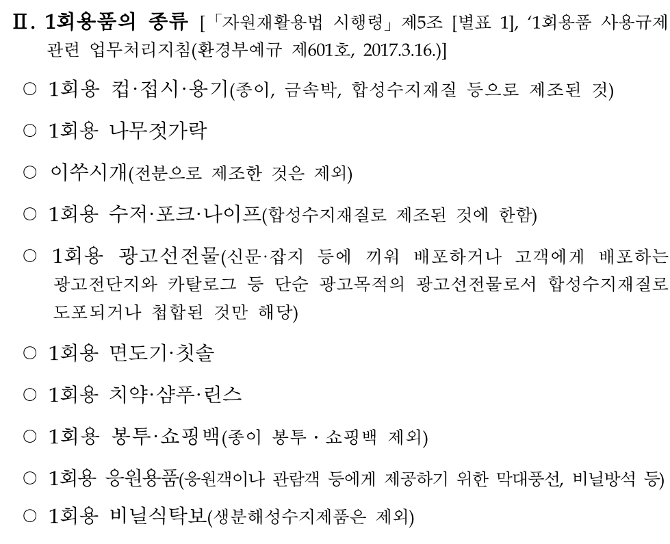 이번에 시행되는 일회용품 사용규제에 해당되는 일회용품은 자원재활용법 시행령 제5조 별표1의 1회용품 사용규제 관련 업무처리지침에 따라 규정되는데 여기에 해당되는 물품은 다음과 같습니다.