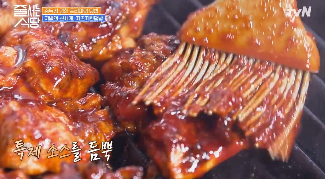 닭다리살을 초벌구이 한 후 특제소스를 듬뿍담은 이 곳의 또하나 명물 치즈치킨덮밥은 반찬으로 나오는 깻잎과 함께, 그리고 또 하나의 포인트인 튀긴 체더치즈로 그 풍미를 더하고 있습니다.