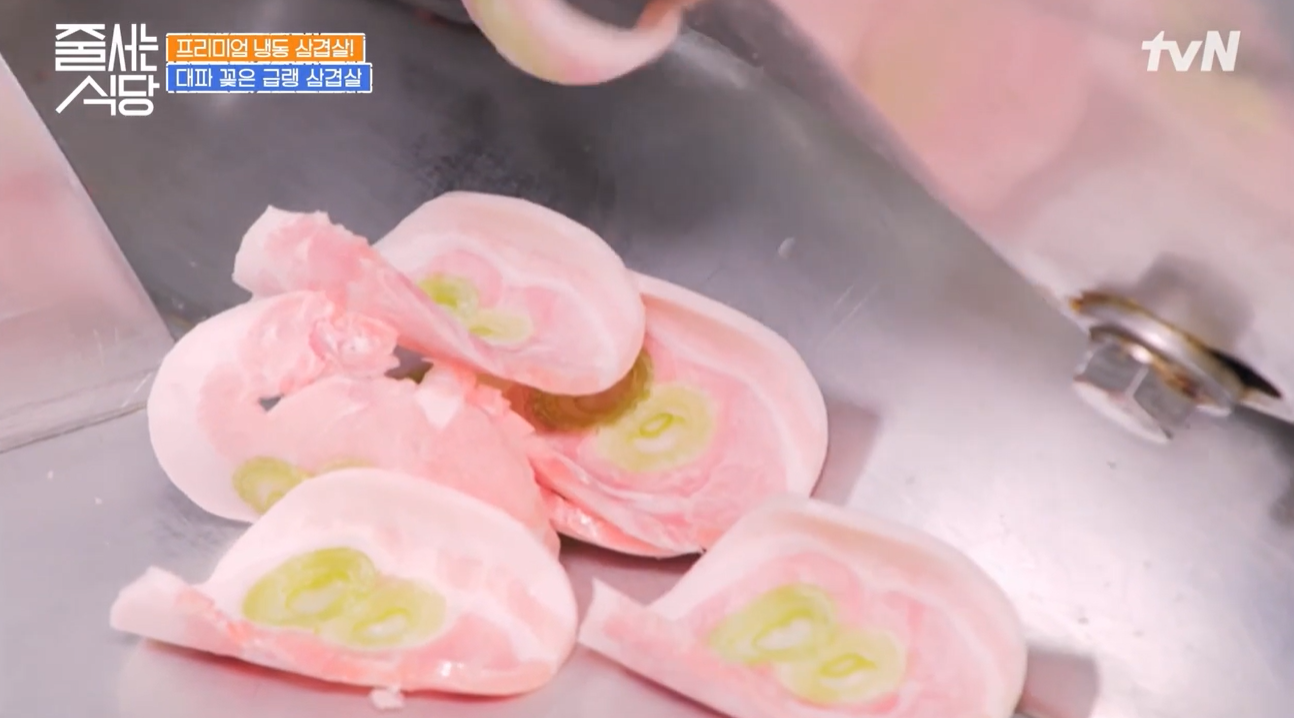 그걸 만들어낸 집이 바로 이 집입니다. 삼겹살 안쪽에 파를 말아서 급랭을 시킨 다음에 얇게 썰으면 삼겹살 안에 파가 말 그대로 송송 박혀 있어 비쥬얼적으로 특이한데 곰곰히 생각해 보면 맛도 예상할 수 있습니다.