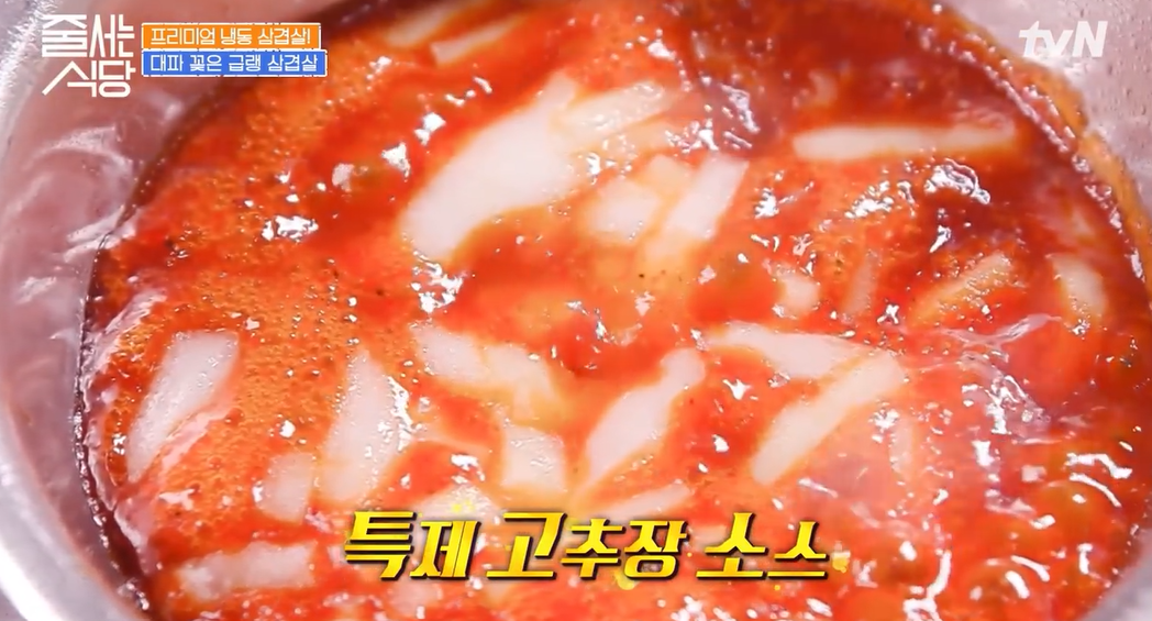 프라이팬위에서 같이 익는 특제 고추장 소스는 다소 느끼해 질 수 있는 삼겹살의 느끼함을 잡아 줌과 동시에 떡볶이와 제육볶음이 동시에 느껴지는 맛을 선사한다고 합니다.