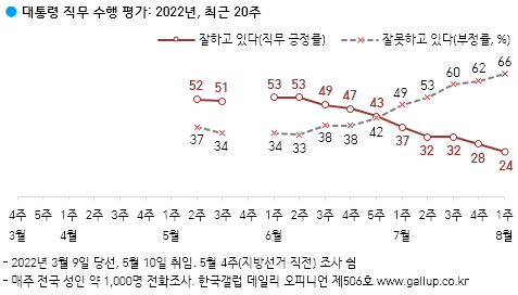 주식에서 여기가 최저인 줄 알았는데 알고보니 지하가 더 있더라는 우스갯 소리처럼 초반 국민 절반의 지지를 받으며 출발한 윤석열 대통령 직무에 대한 평가가 이번 결과에서 잘하고 있다가 24%, 잘못하고 있다가 66%를 받으며 지난 한국갤럽 여론조사가 최악으로 생각했지만 이번 여론조사에서는 보다 최악의 결과를 받아 임기 두 달만에 최악의 성적표를 받고 있는 것으로 보입니다. 다만, 최악을 향하고 있다는 점은 정치적, 정책적인 반전의 포인트를 찾으면 반전도 가능하다는 의미지만 딱히 반전 포인트가 없다라는 것은 큰 문제입니다.