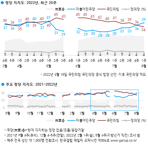대통령 지지율 및 정당 지지율 한국갤럽 여론조사 정리(8월 5일 발표)