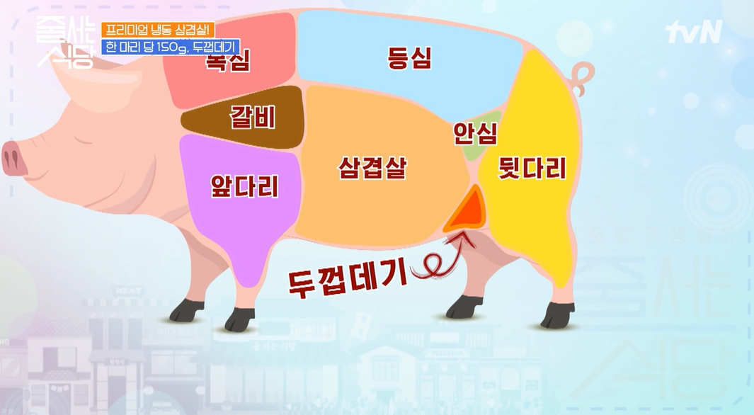 우리가 흔히 돼지를 먹는 부위는 목살, 등심, 갈비, 앞다리, 뒷다리, 안심, 그리고 삼겹살인데 삼겹살과 뒷다리 사이에 두껍데기라는 부위가 있어 식감을 즐기는 분들에게 특이함을 선사한다고 합니다.