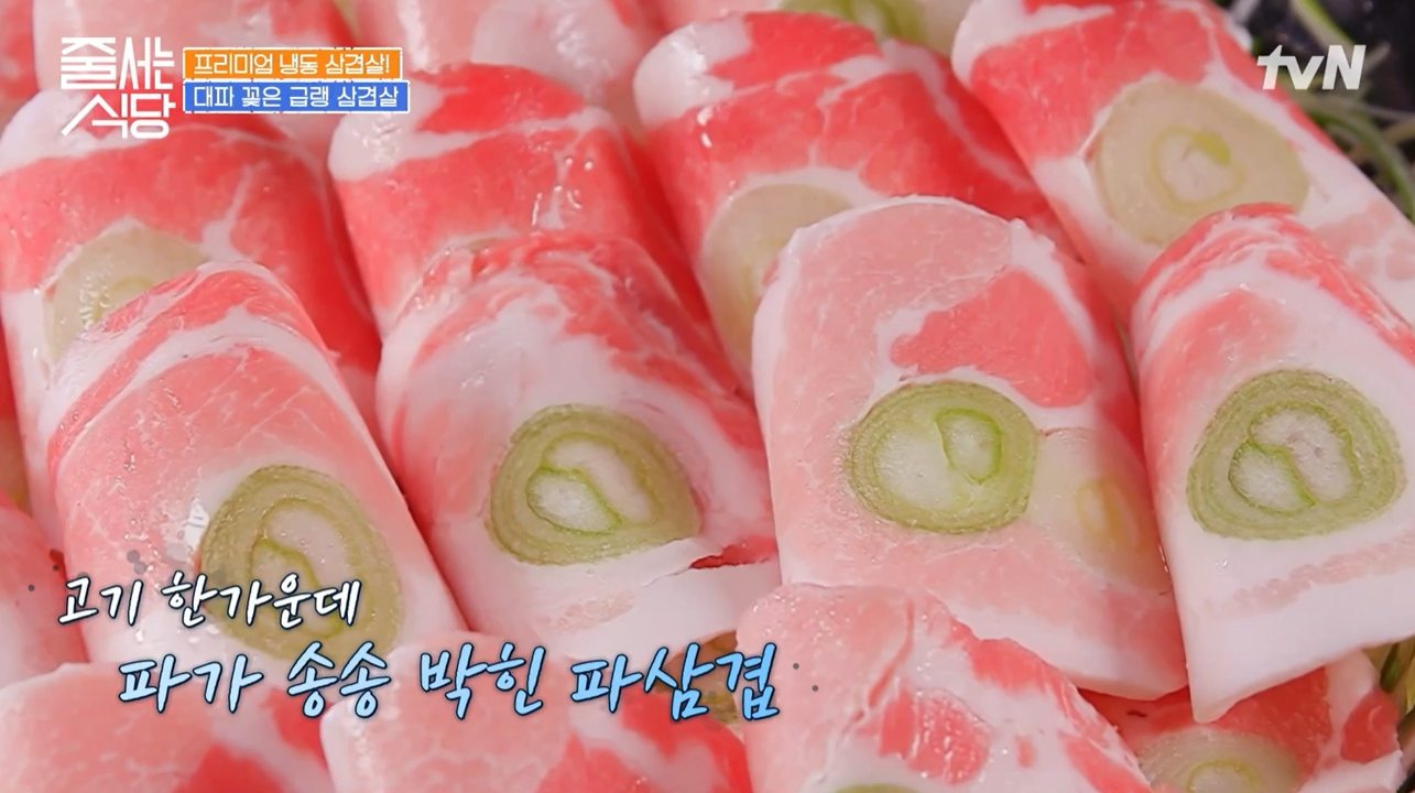 그걸 만들어낸 집이 바로 이 집입니다. 삼겹살 안쪽에 파를 말아서 급랭을 시킨 다음에 얇게 썰으면 삼겹살 안에 파가 말 그대로 송송 박혀 있어 비쥬얼적으로 특이한데 곰곰히 생각해 보면 맛도 예상할 수 있습니다.