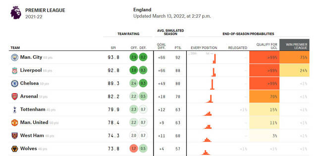 한달 전인 3월 13일에 빅데이터 통계 분석 매체 파이브써티에잇이 발표한 챔피언스리그 출전권을 두고 다투는 팀들을 대상 챔피언스리그 진출확률은 3위 첼시가 99%, 당시 4위 아스날이 70%, 5위 토트넘은 15%로 상당히 어려워 보였습니다. 하지만, 4월 10일 현재기준으로는 4위 토트넘이 65%, 5위 아스날은 33%로 한달전의 빅데이터 통계 분석을 넘어서고 있을 정도로 상승세입니다.